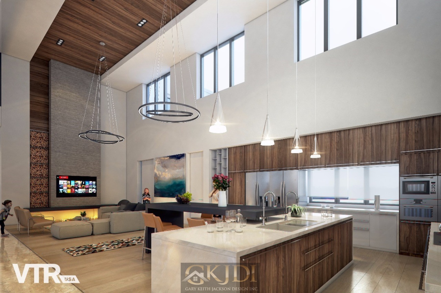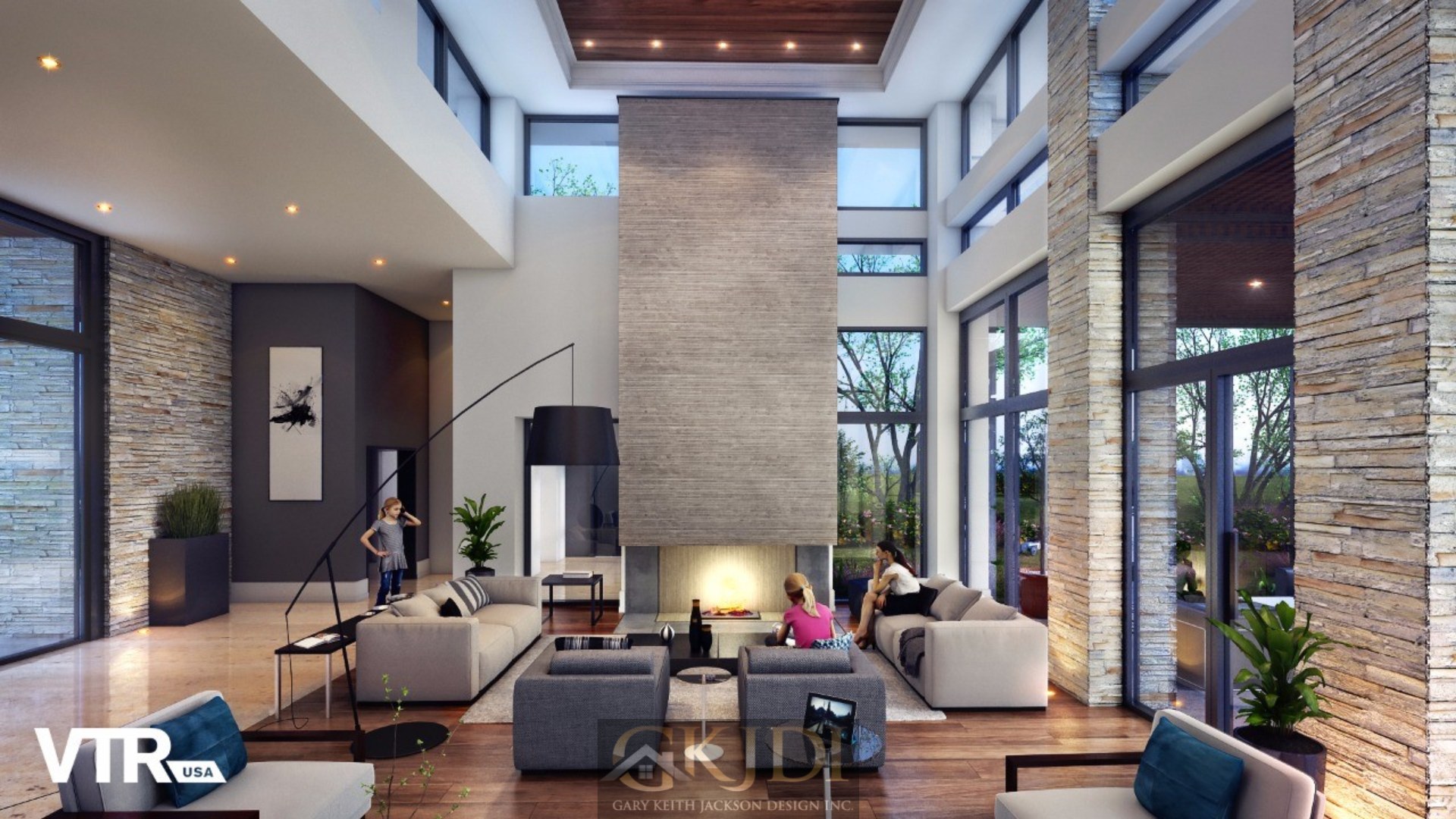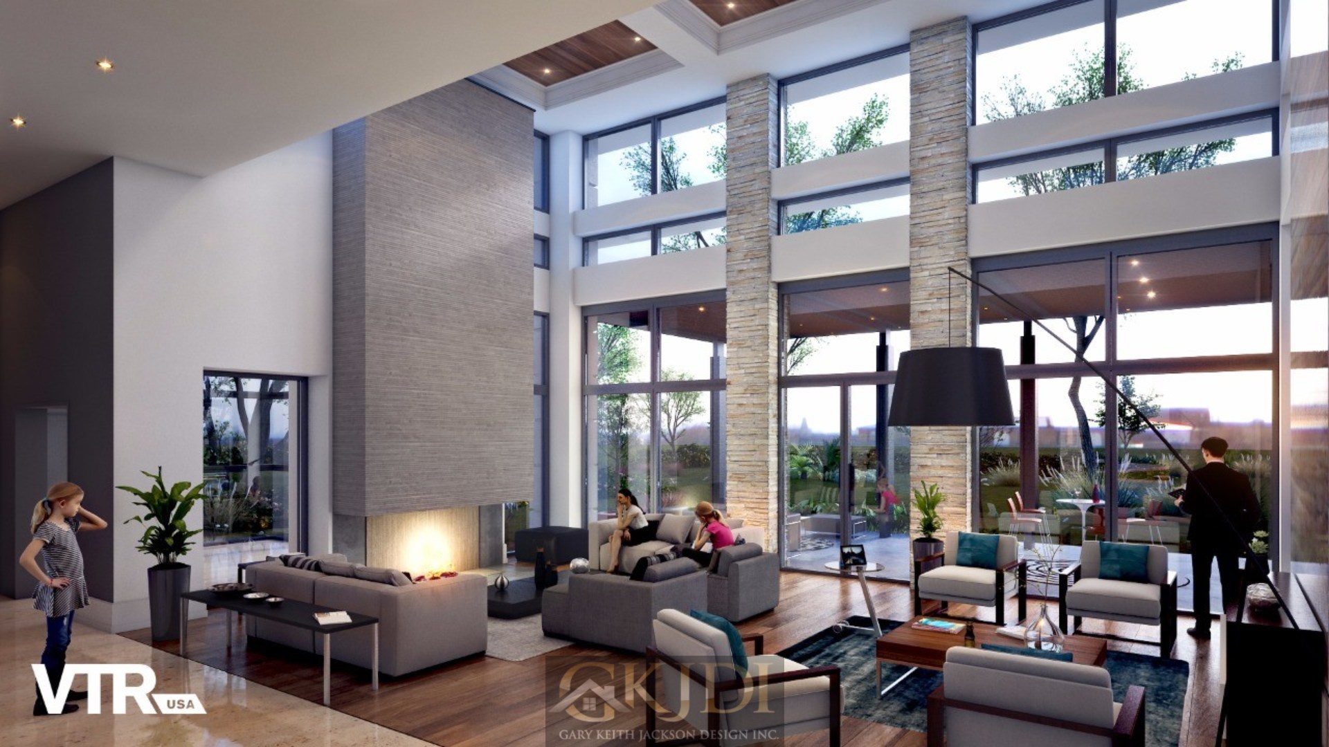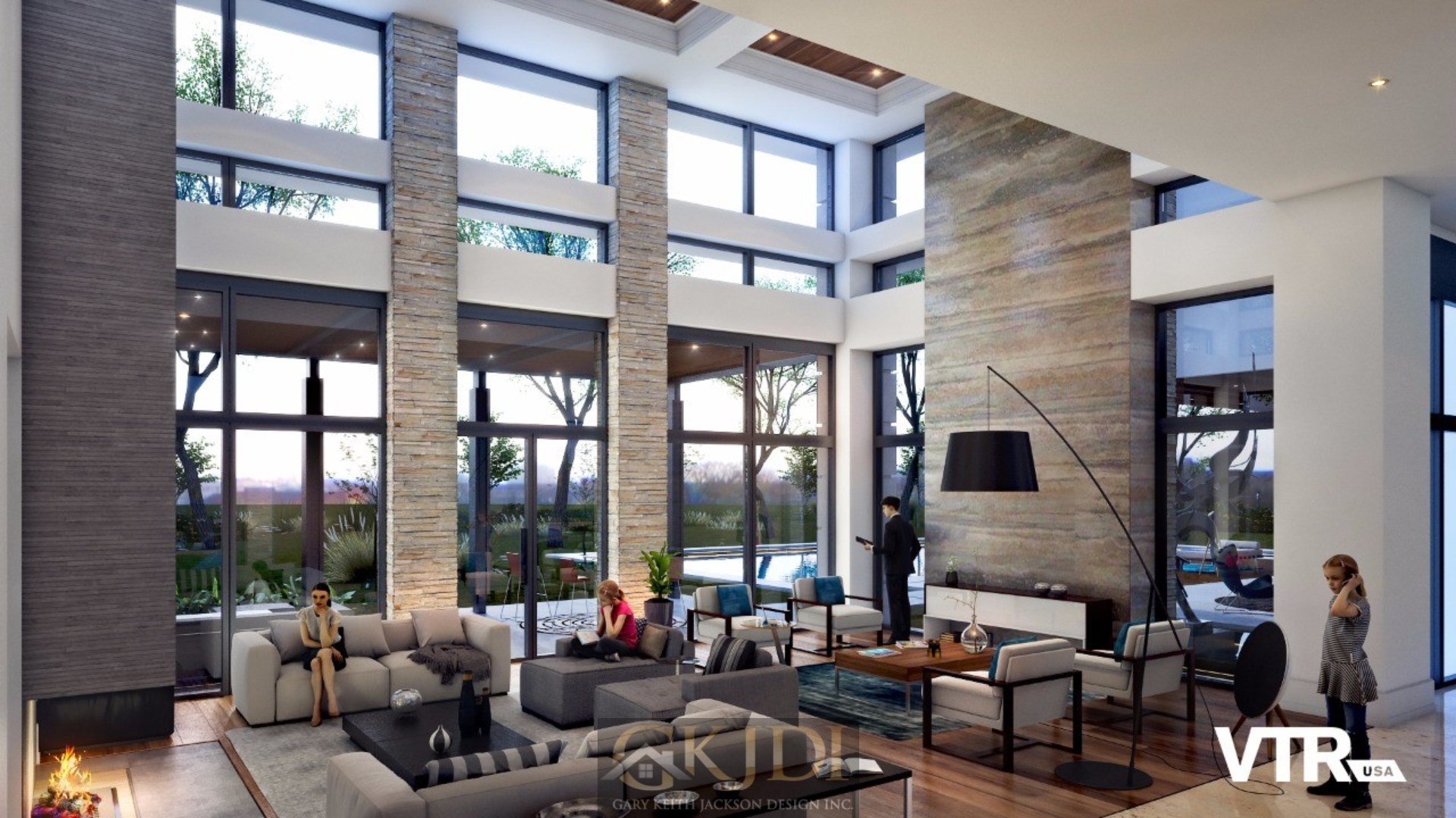 Approaching the custom pivoting wood front door, you’re greeted by steppingstones floating above a reflective pool, fed by an awe-inspiring vertical water wall. Stepping inside the foyer, your gaze is immediately drawn to the grand salon, a dramatic living room reminiscent of a luxury hotel lounge. Walls of glass, a soaring two-story ceiling with clerestory windows, and a focal stone fireplace create a space of unrivaled elegance.