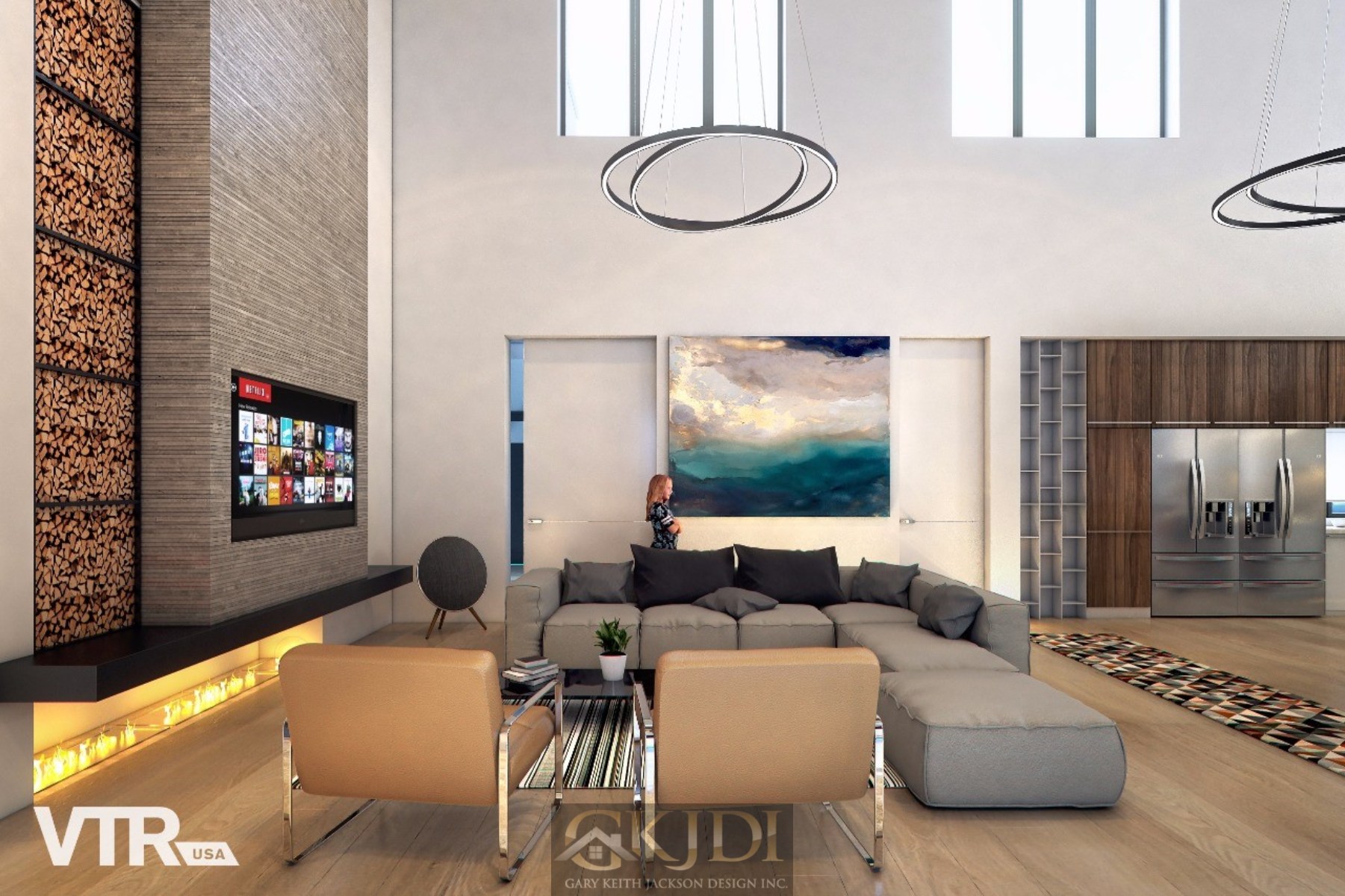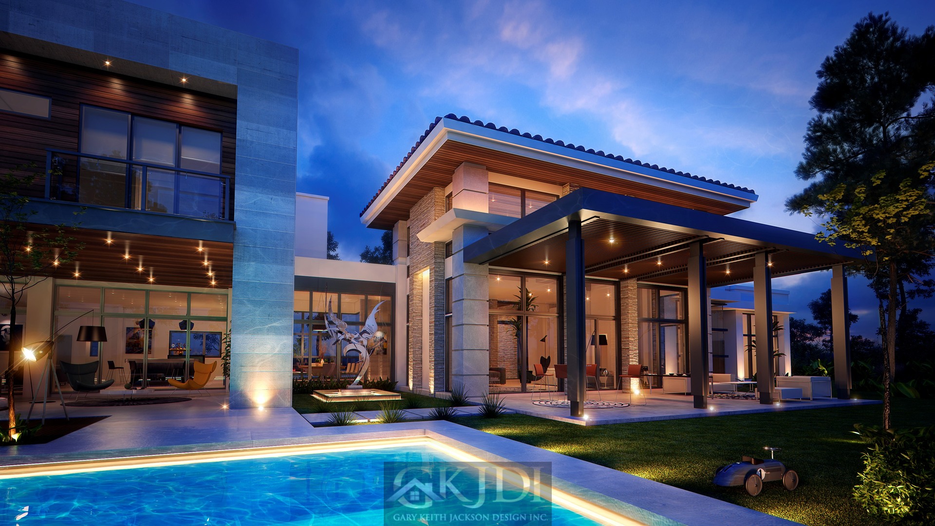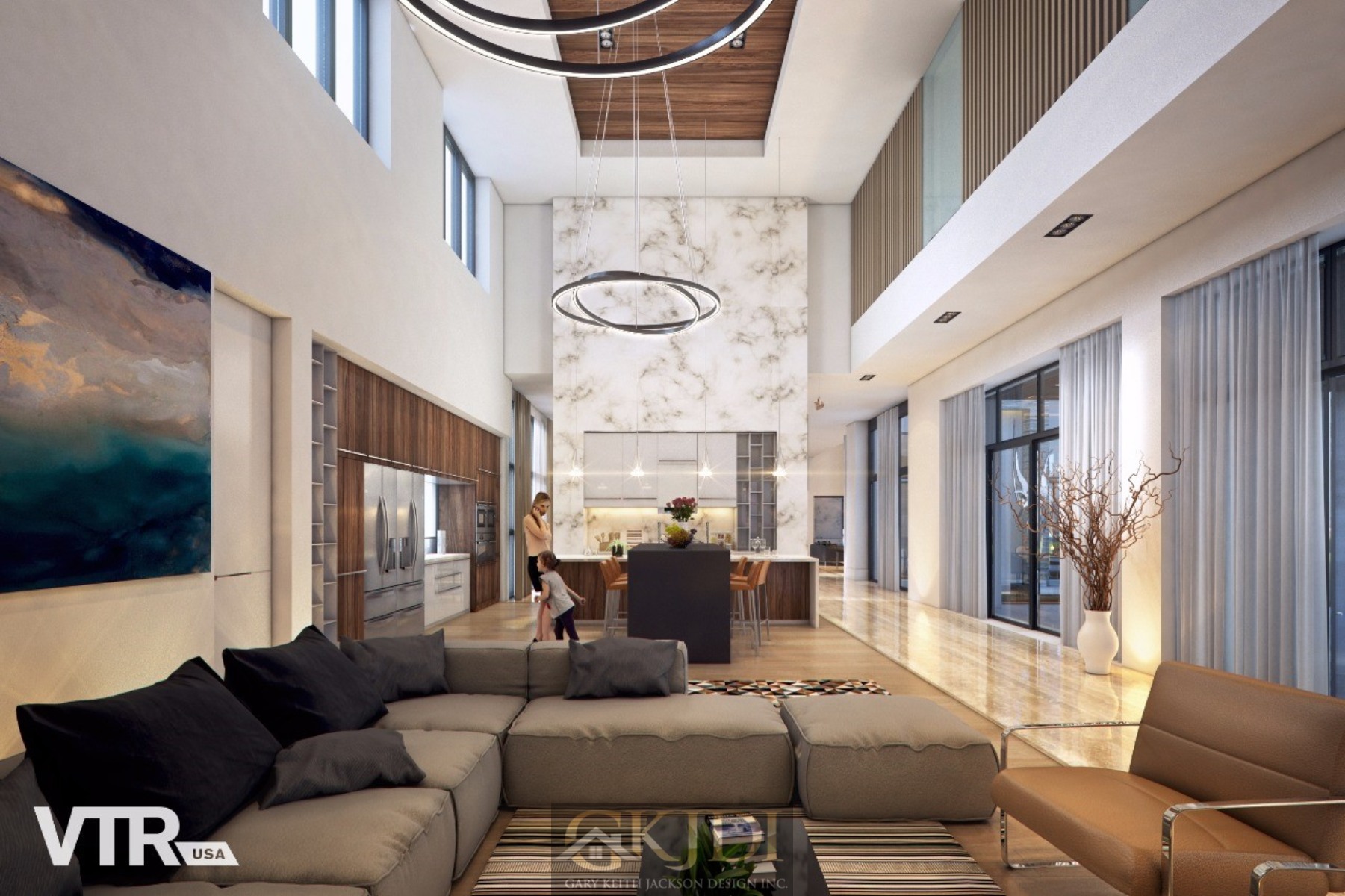 Approaching the custom pivoting wood front door, you’re greeted by steppingstones floating above a reflective pool, fed by an awe-inspiring vertical water wall. Stepping inside the foyer, your gaze is immediately drawn to the grand salon, a dramatic living room reminiscent of a luxury hotel lounge. Walls of glass, a soaring two-story ceiling with clerestory windows, and a focal stone fireplace create a space of unrivaled elegance.