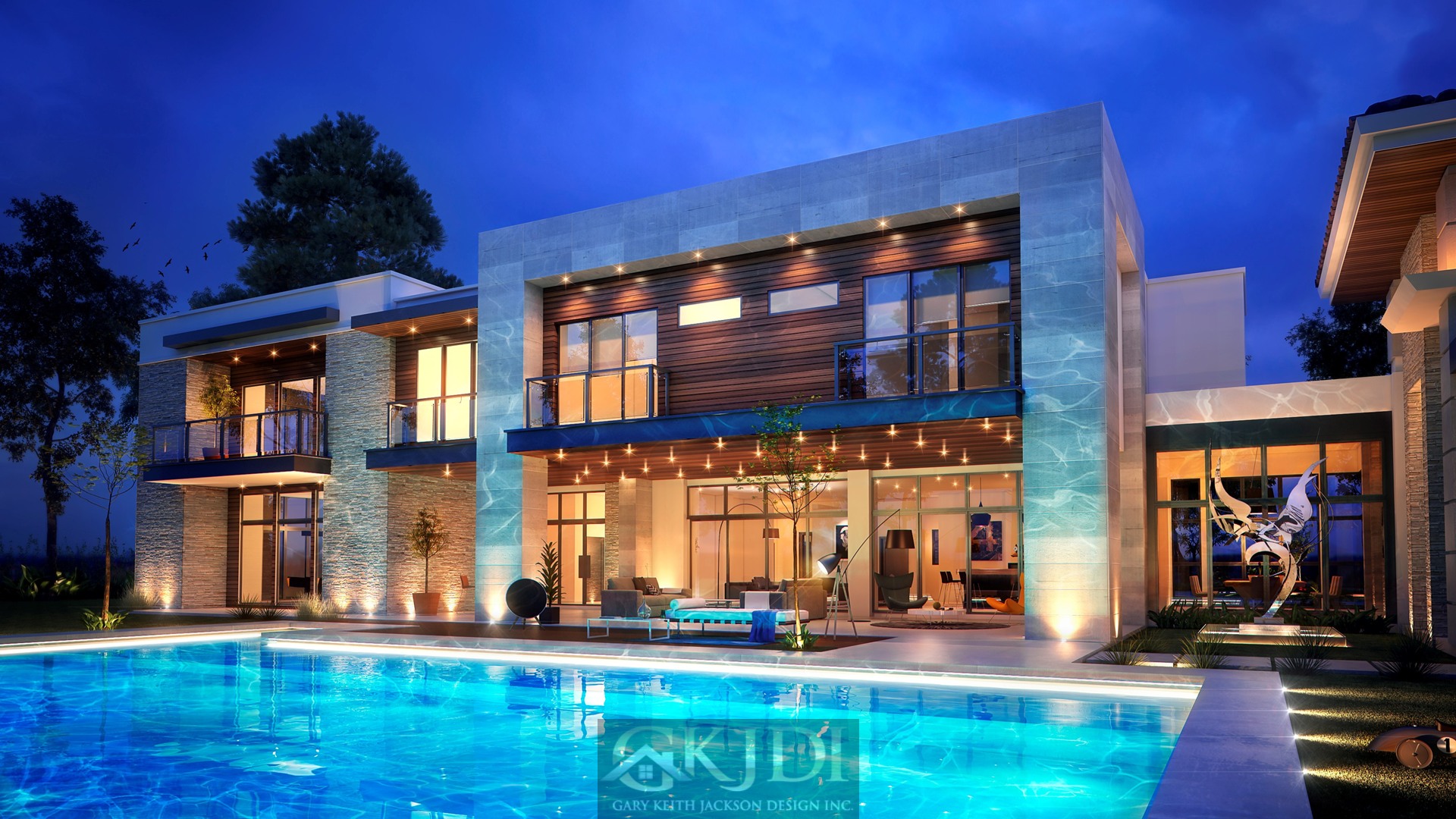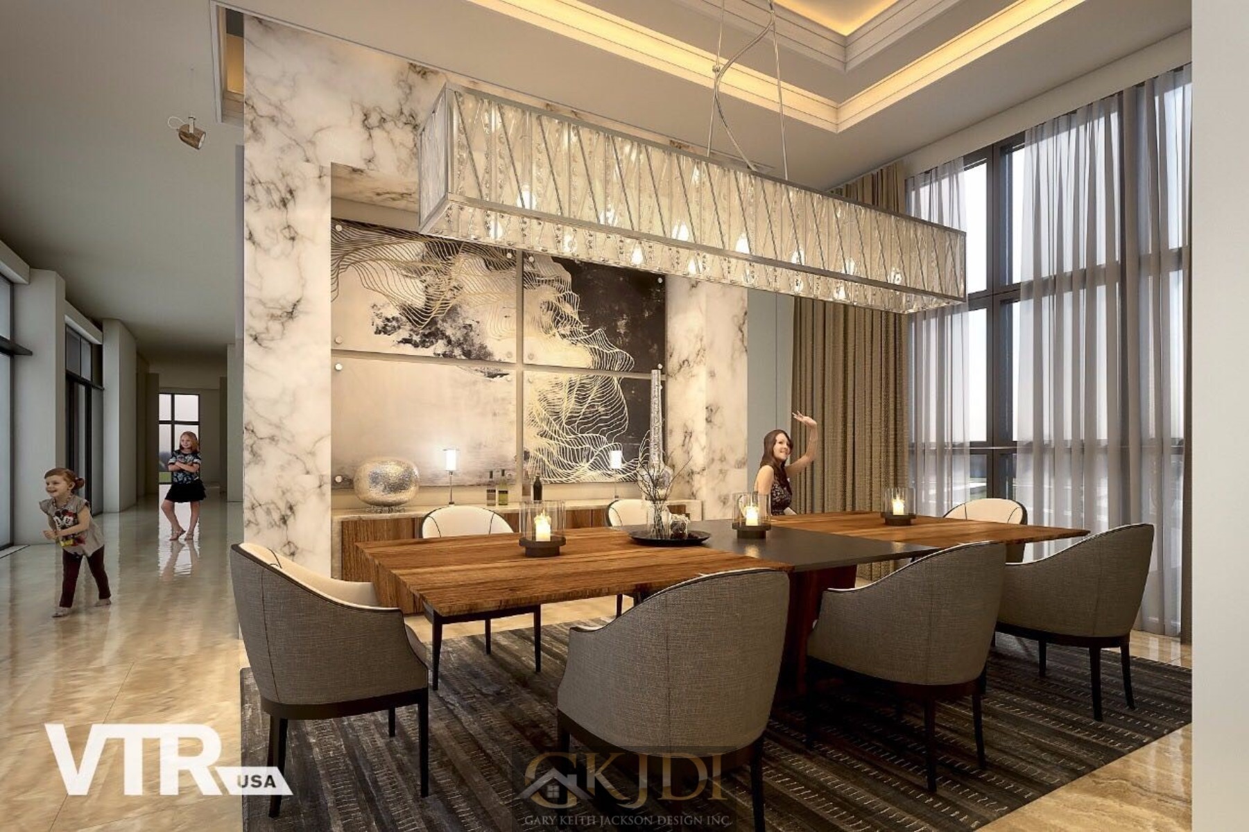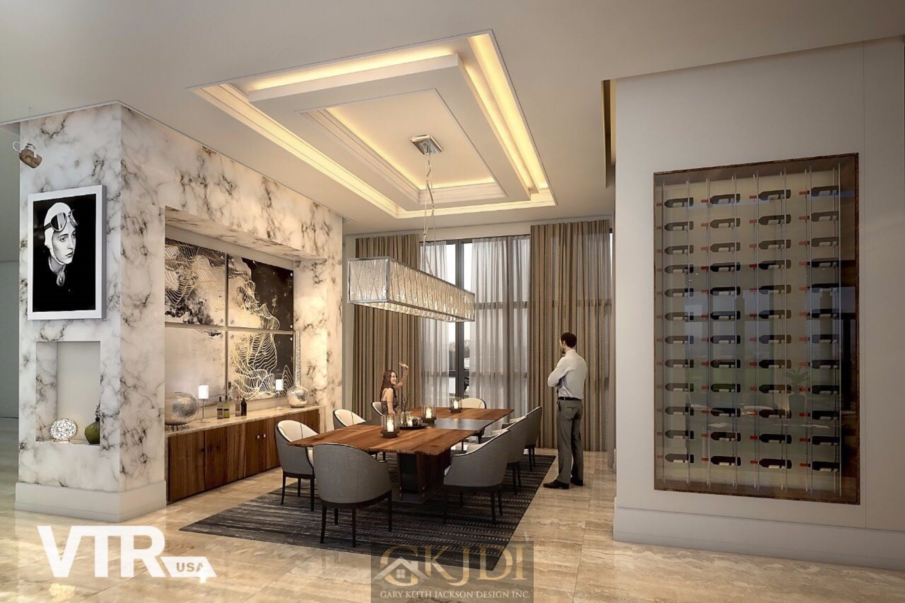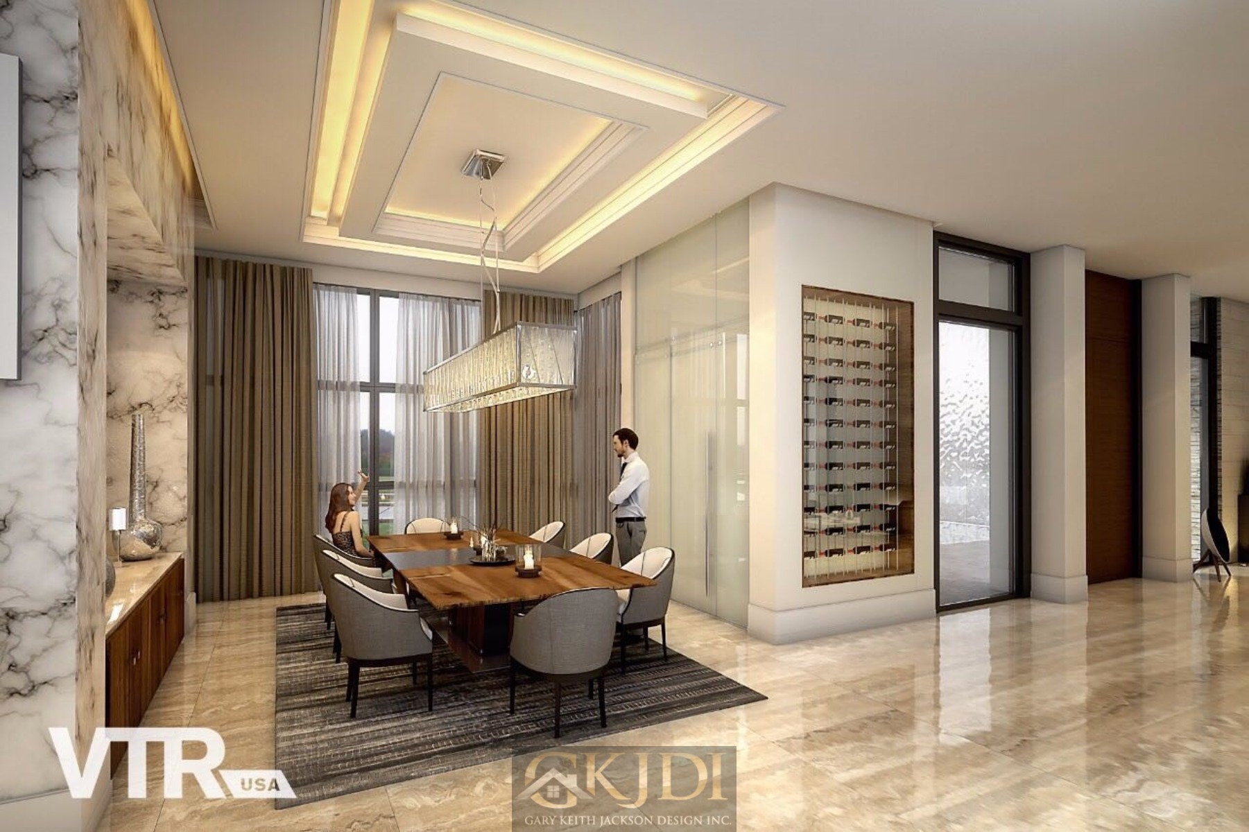 Approaching the custom pivoting wood front door, you’re greeted by steppingstones floating above a reflective pool, fed by an awe-inspiring vertical water wall. Stepping inside the foyer, your gaze is immediately drawn to the grand salon, a dramatic living room reminiscent of a luxury hotel lounge. Walls of glass, a soaring two-story ceiling with clerestory windows, and a focal stone fireplace create a space of unrivaled elegance.