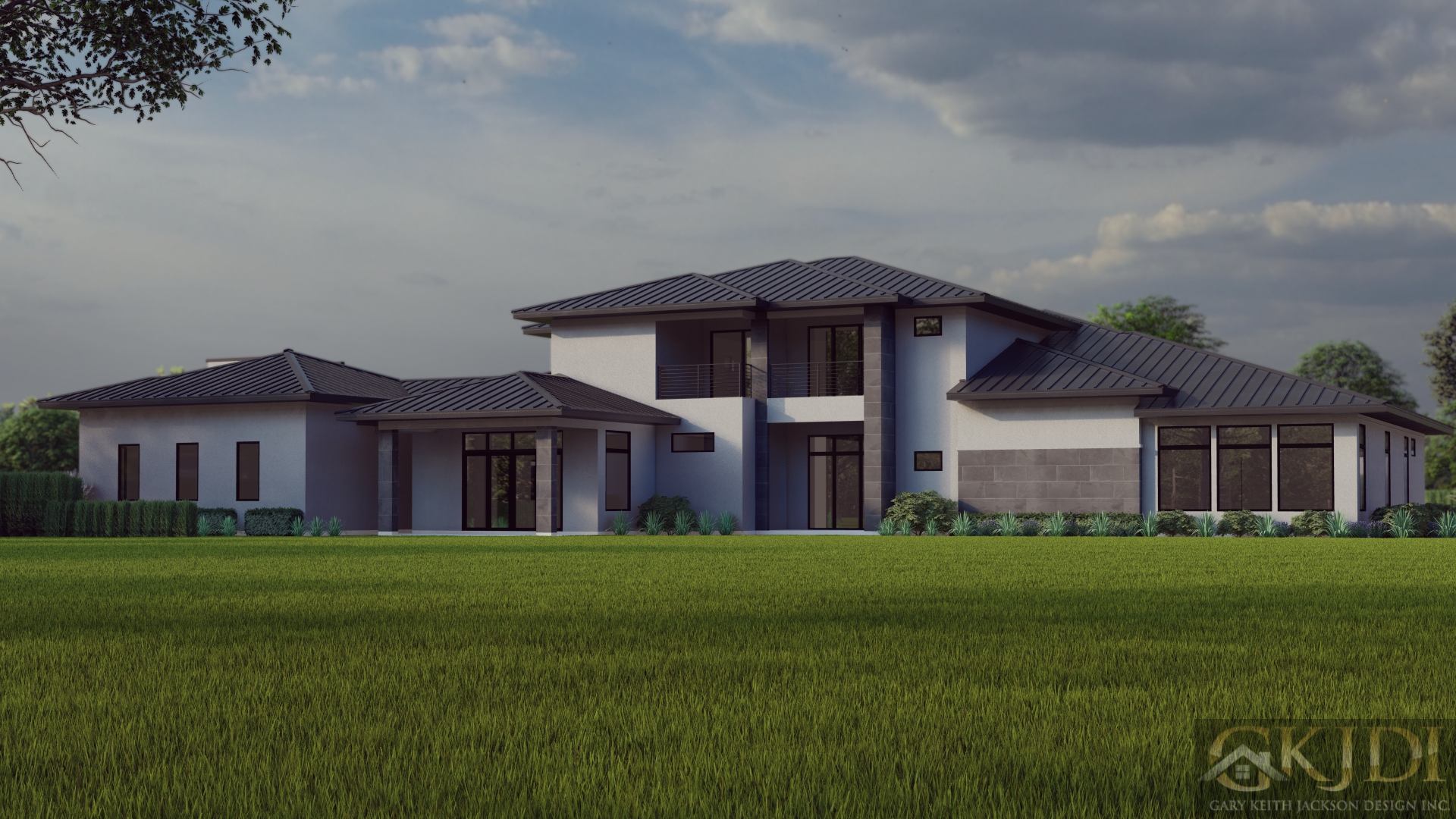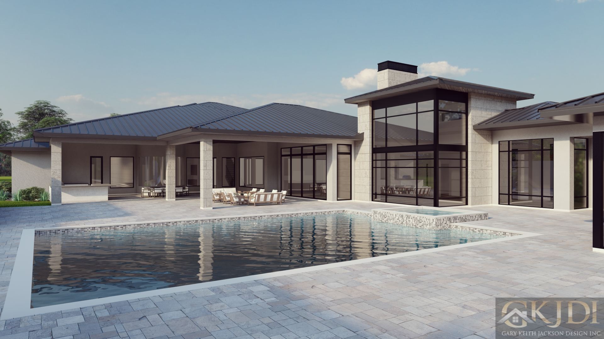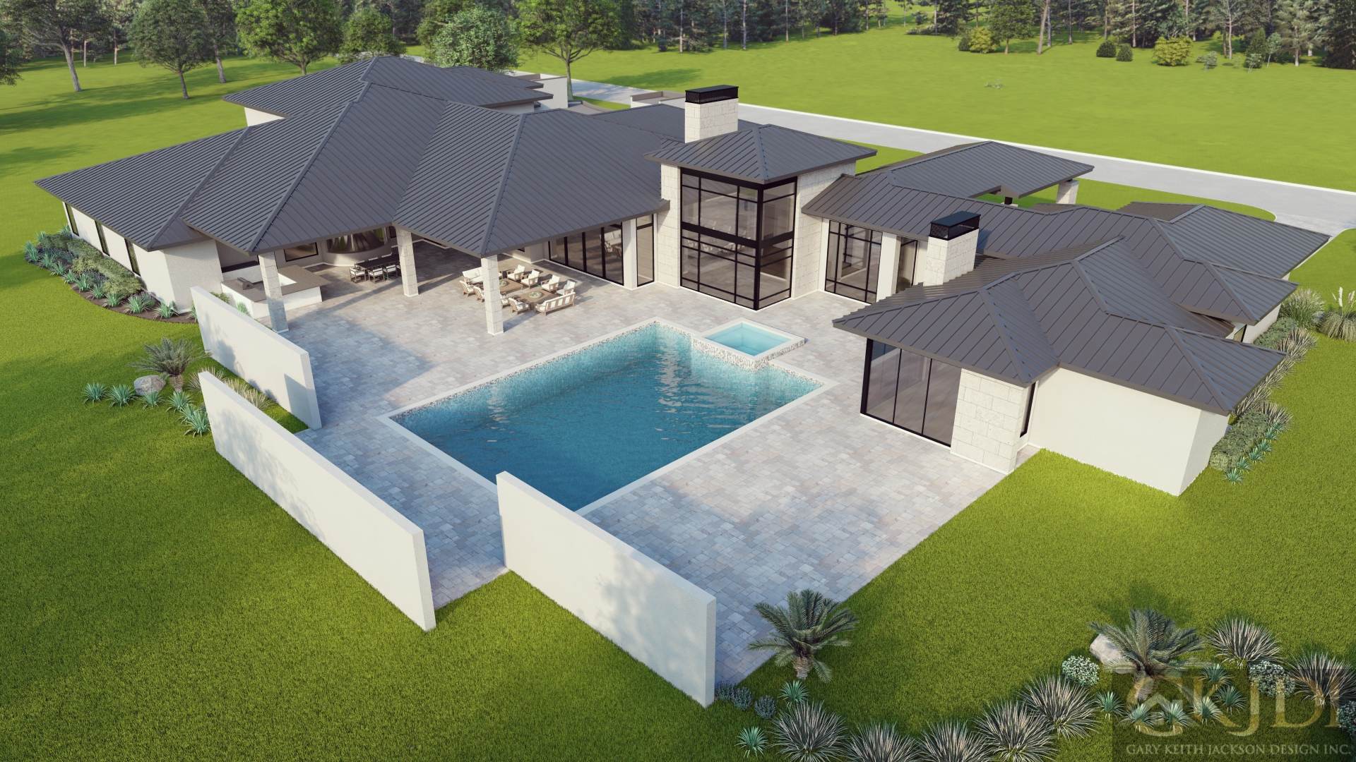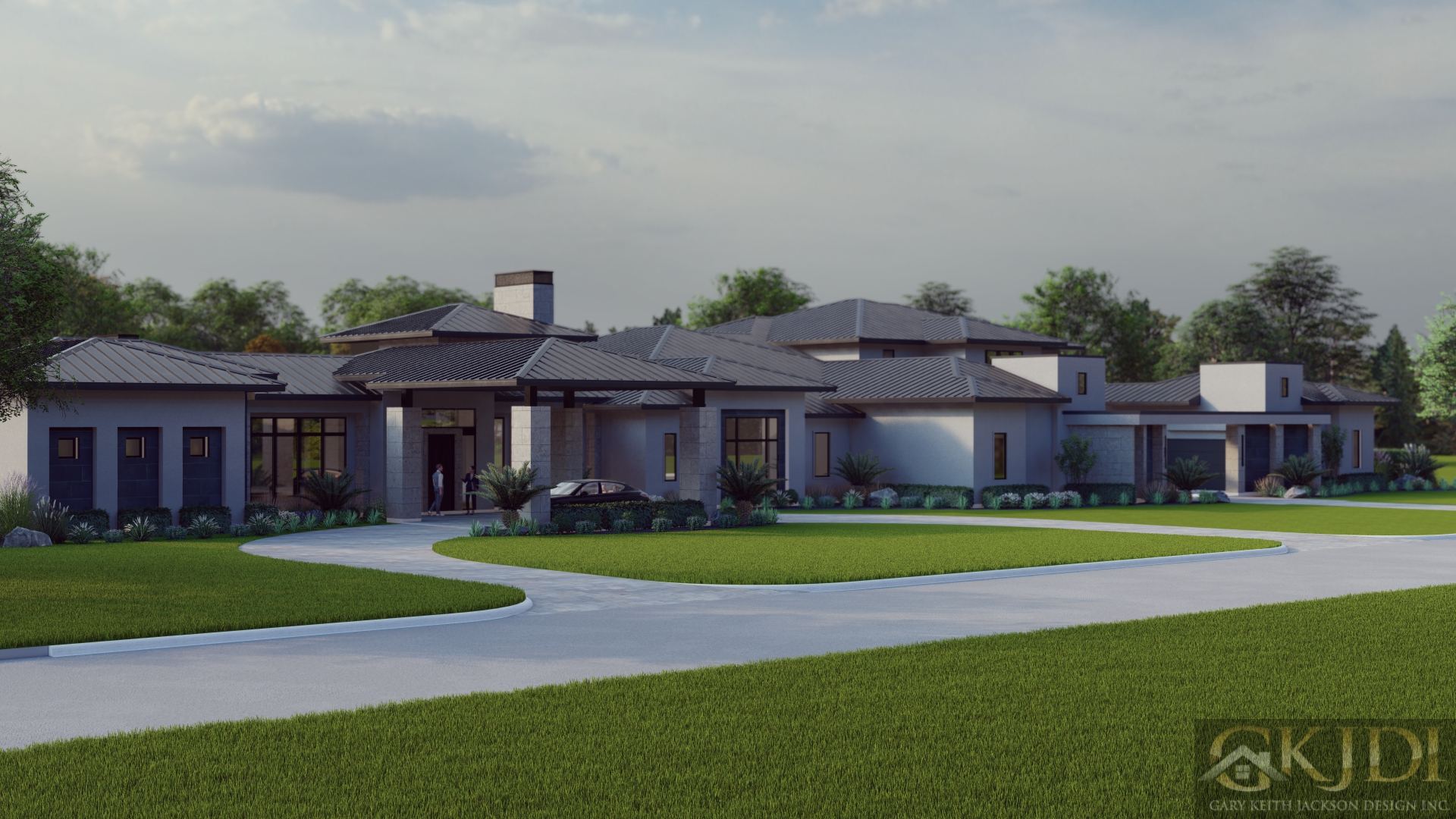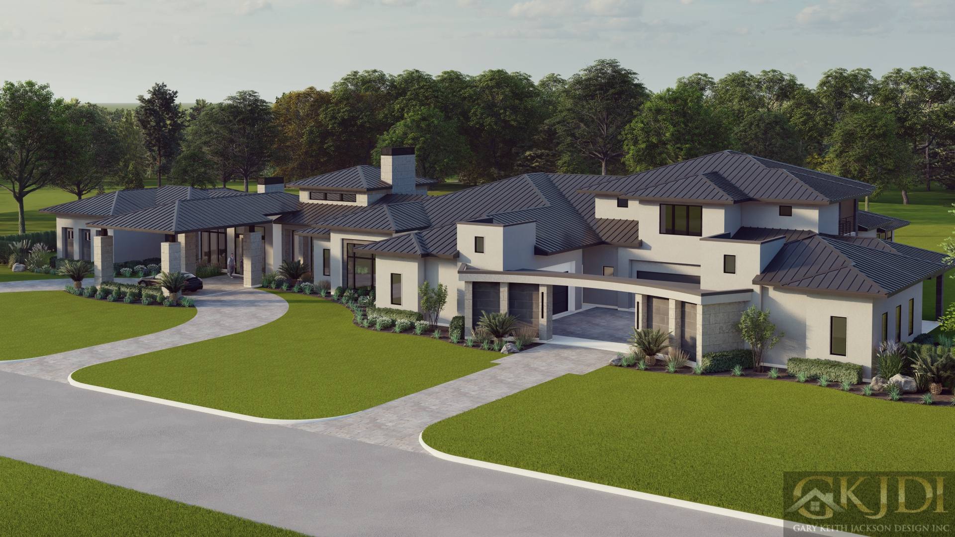 This sprawling luxurious 10,000-square-foot, five-bedroom, one-and-a-half-story home uniquely blends modern elegance with a timeless prairie style vibe and unparalleled craftsmanship. Featuring a striking dark low pitched metal roof, stucco, and limestone finishes, the home’s façade is anchored by a stately front entry drive-through porte-cochere along with the side entrance porte-cochere that leads into a gated motor court with an eight-car garage, complete with several lifts for the car enthusiast. The expansive rear of the home boasts a massive, covered veranda with a summer kitchen, overlooking a resort-style pool, all accessible from the primary rooms downstairs.